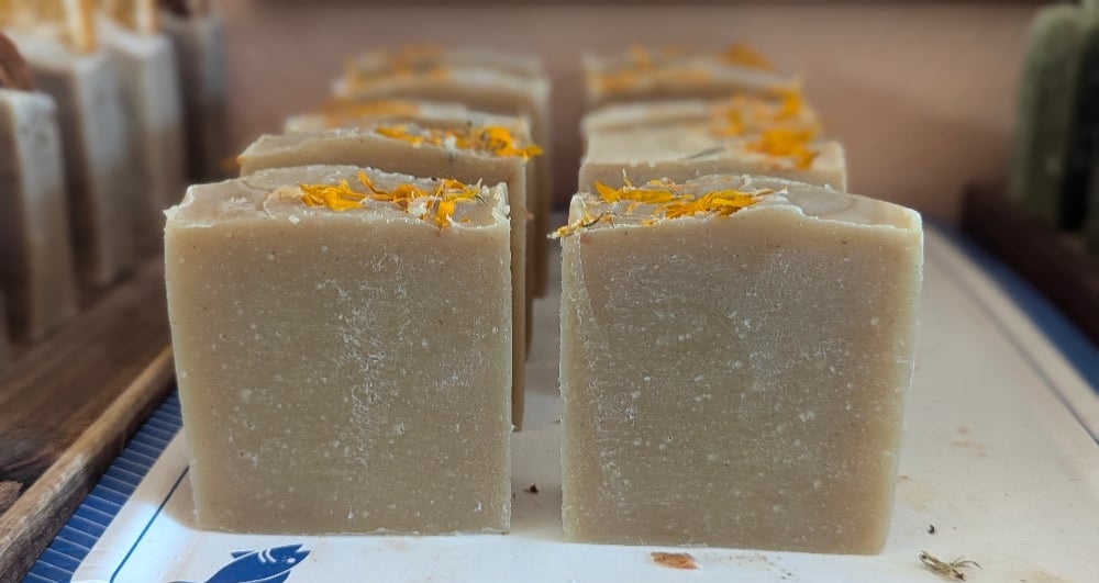 Made with homegrown purple carrots cooked to a pureé, tumeric and aloe pulp from my garden. a moisturizing a brightening bar, it even smell like a carrot! Scented with Ginger and Tumeric essential oils