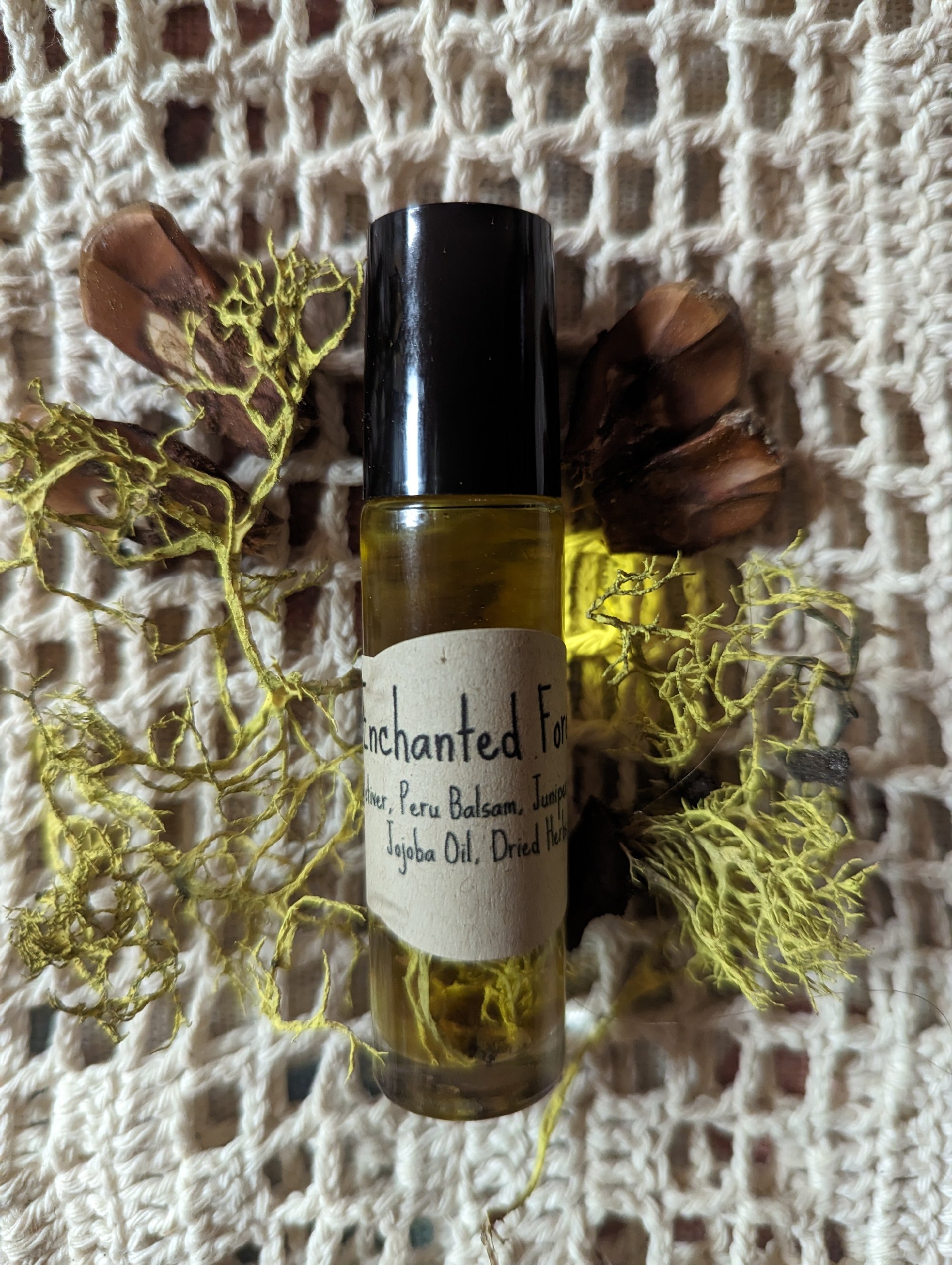Notes: Vetiver, Peru Balsam, Juniper Berry and Sage in a Jojoba oil base. Contains dried foraged moss from Yosemite and pinecones.