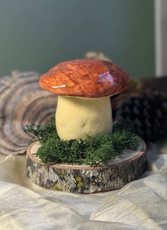 Mushroom sculptures inspired by real ones I've found on my foraging adventures. made with Sculpey oven-bake clay, hand painted with acrylics and topped with a glaze. They are attacked to a base made from a Maple branch from my backyard with moss and lichen covered twigs.