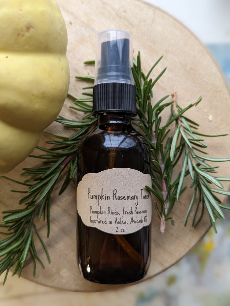 This is by far my favorite product I've made! I hate wasting leftover pumpkin decor so I decided to do something beneficial with them! Pumpkins have lots of skin loving qualities such as being high in Vitamin A, salicylic acid and beta glucans (that helps with dark spots and fine lines). I also added fresh Rosemary from the garden, which is antibacterial and tonifying, which also helps with acne. It was then tinctured in 100 proof vodka for two weeks to extract the herbal properties and mixed with Avocado oil, which is soothing and hydrating. In a glass 2 oz. spray bottle.
